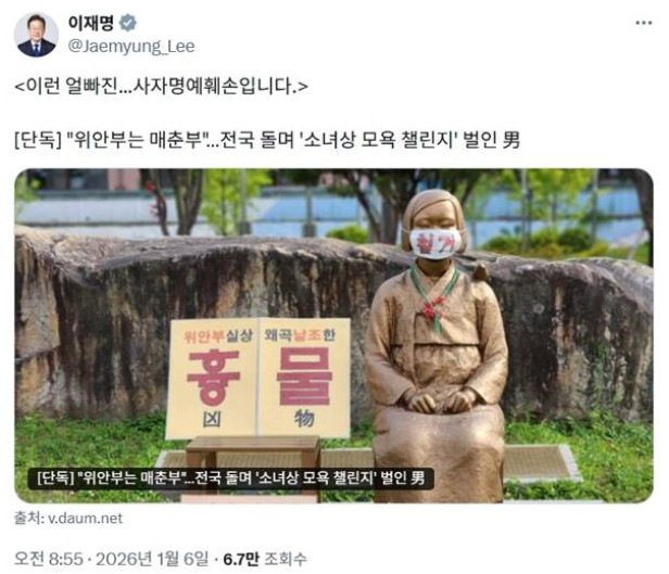 이재명 대통령은 자신의 SNS에 이번 사건을 다룬 보도를 공유하면서 “이런 얼빠진… 사자 명예훼손입니다”라는 메시지를 남겼다. 여기서 말하는 사자 명예훼손은 이미 사망한 사람의 명예를 훼손하는 행위를 의미한다.