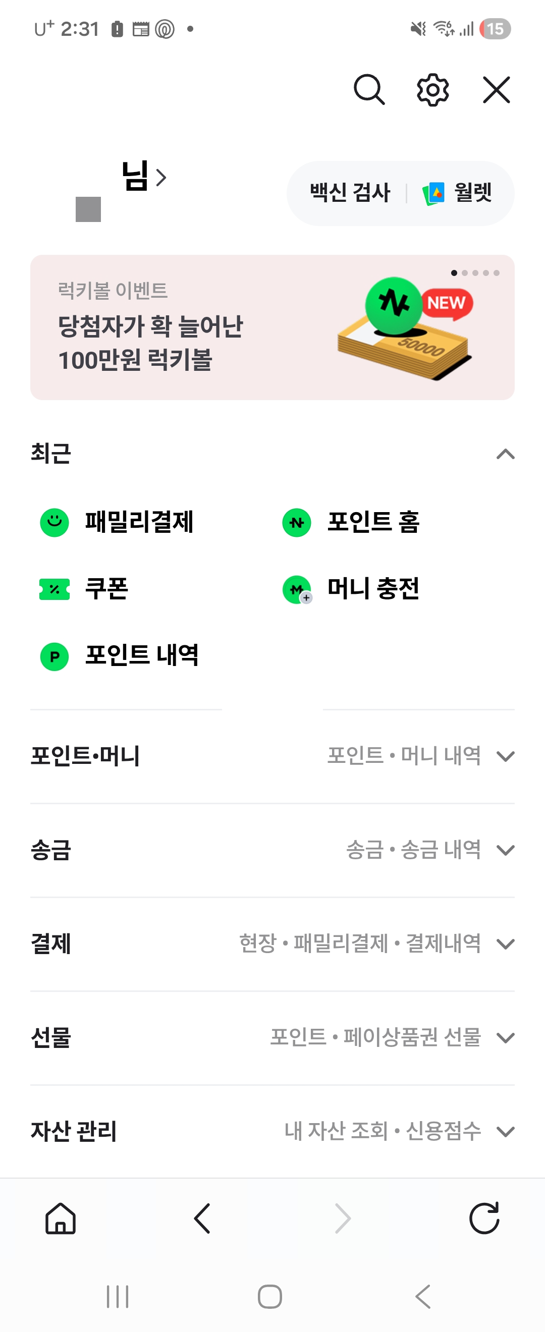 네이버페이 ‘백신 검사’ 메뉴 위치
