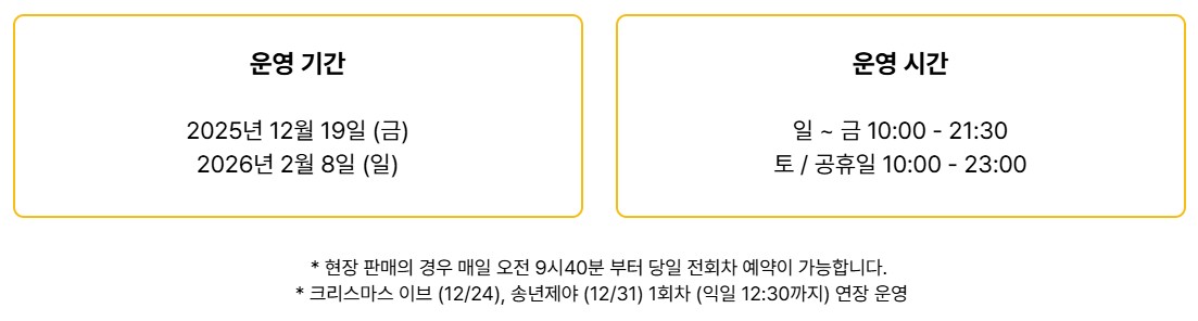 2025년 12월 19일(금)부터 2026년 2월 8일(일)까지 운영된다. 겨울 한정 시즌 운영이라 “언제까지 하나요” “예약은 언제 열리나요” 같은 검색이 함께 증가한다.