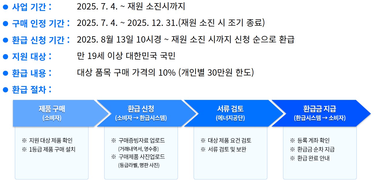 본 환급사업의 대상은 국내에 거주하는 개인 소비자입니다. 단, 사업자 명의 구매나 중고·리퍼비시 제품은 제외되며, 고효율(최상위 등급 또는 지정 효율기준 충족) 인증을 받은 신제품만 인정됩니다. 또한 정해진 기간 내 구매·신청해야 하며, 동일 가전제품군은 1인 1회만 신청 가능합니다. 예산 한도 내 선착순 운영이므로, 구매 후 지체 없이 신청하는 것이 유리합니다.