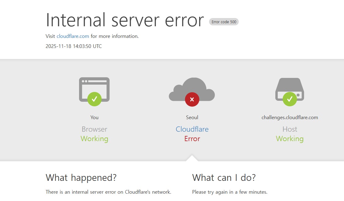 한국시간으로 오후 10시 9분 경에 오류가 발생한 이번 장애는 클라우드플레어의 글로벌 네트워크에 발생한 장애로 전 세계적으로 피해가 속출하고 있습니다.