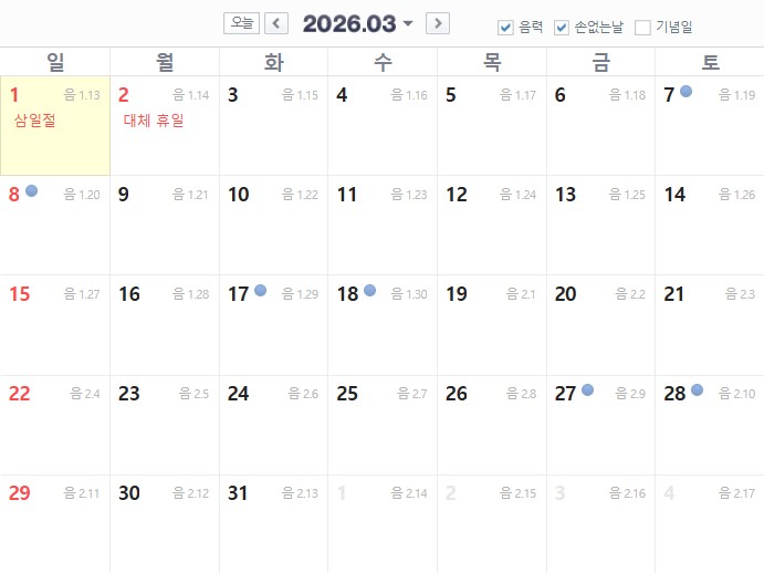 - 2026년 3월 손없는 날 (양력) : 7일, 8일, 17일, 18일, 27일, 28일