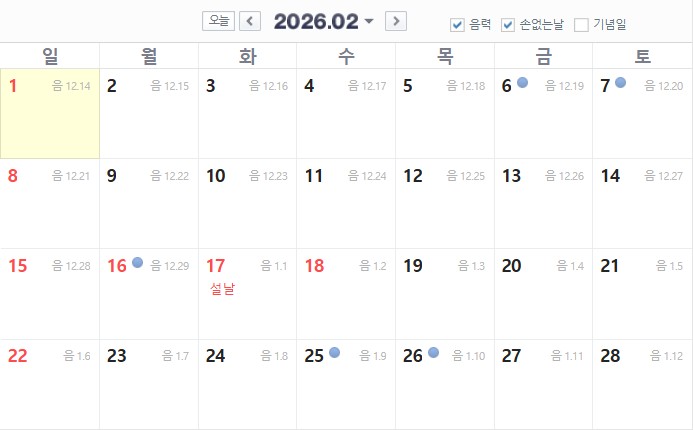 - 2026년 2월 손없는 날 (양력) : 6일, 7일, 16일, 25일, 26일