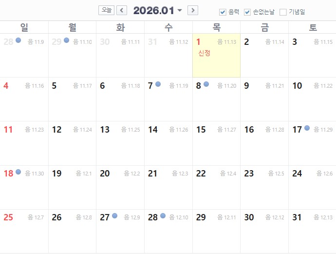 - 2026년 1월 손없는 날 (양력) : 7일, 8일, 17일, 18일, 27일, 28일
