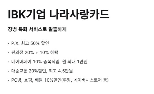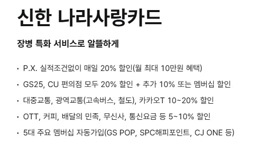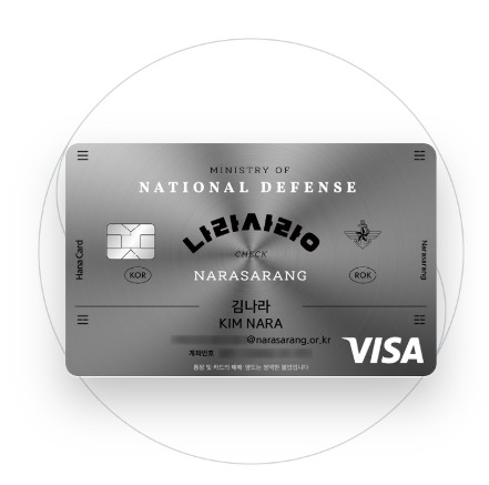 나라사랑카드는 병역판정검사를 받는 시점에 발급되는 군인 전용 체크카드로, 병사 급여 수령 계좌와 연동된다. 군 복무 중뿐 아니라 전역 이후에도 일반 체크카드처럼 사용할 수 있다.